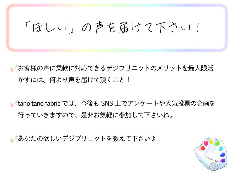 tano tano fabric では現在、よりワクワクする新しいラインナップとして「デジプリニット」の商品を開発しています。