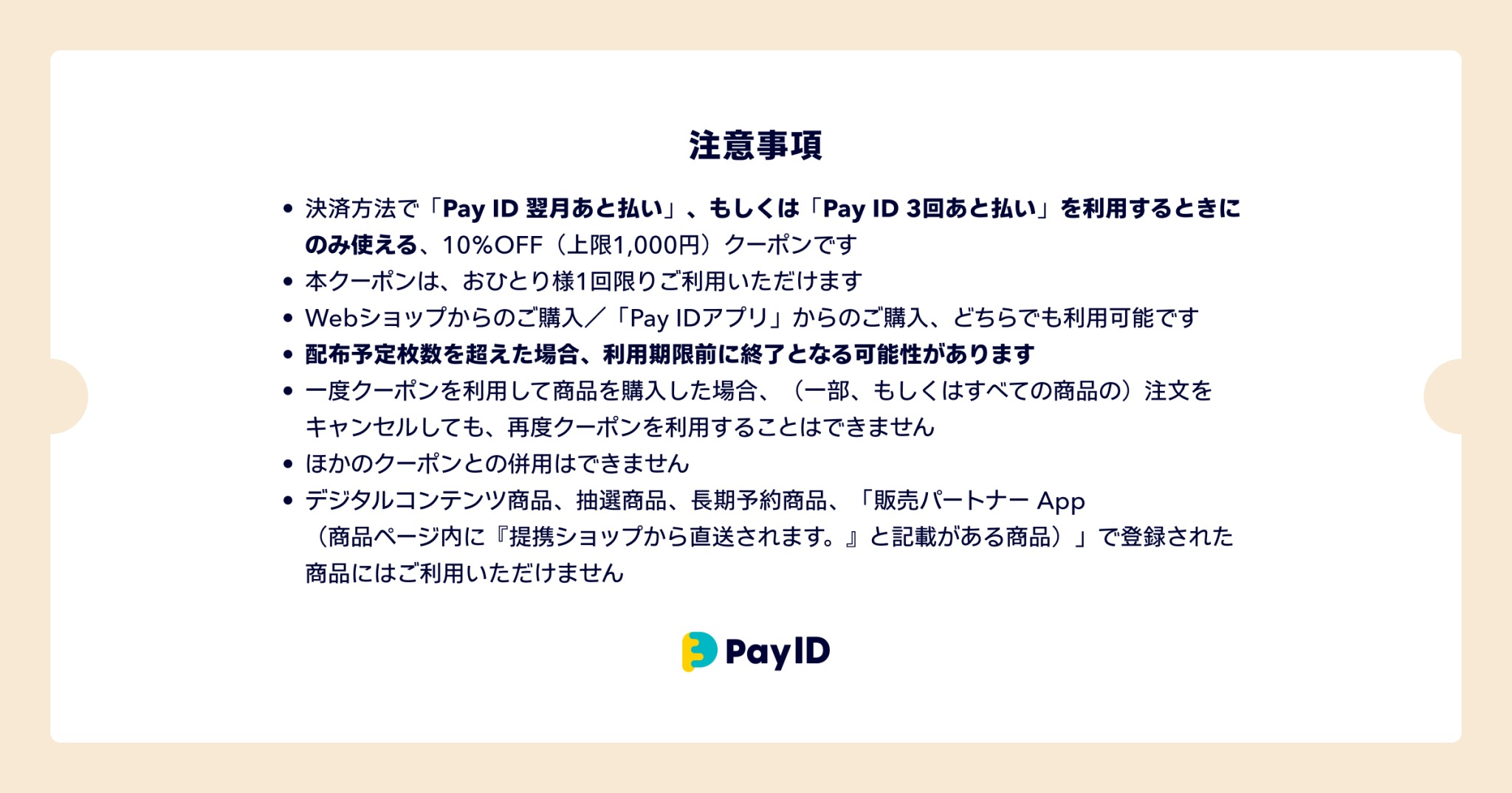 「Pay ID あと払い」でのお買いものが最大10%OFF(上限1,000円)になるクーポンです。
